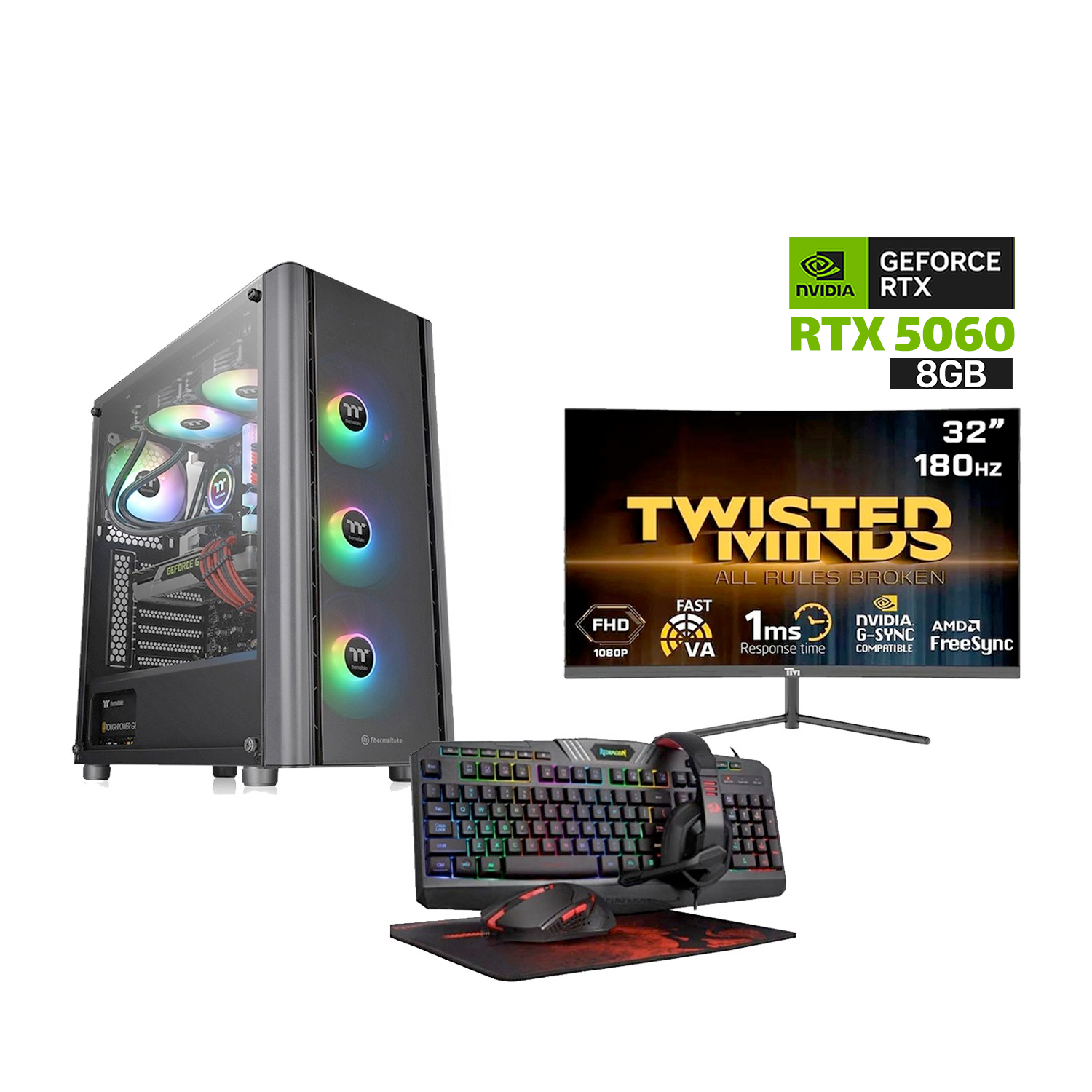 كمبيوتر ألعاب Ultra 5 225F CPU، لوحة أم ASUS H810 WIFI، ذاكرة وصول عشوائي 16 جيجابايت D5، قرص SSD NVME سعة 1 تيرابايت، بطاقة رسومات RTX 5060 8 جيجابايت VGA، مزود طاقة 750 واط، هيكل Thermaltake V250 TG مع 3 مراوح ARGB، نظام التشغيل Windows 11 Pro + شاشة ألعاب Twisted Minds منحنية 32 بوصة FHD 180 هرتز + مجموعة ألعاب Redragon 4 في 1 RGB سلكية