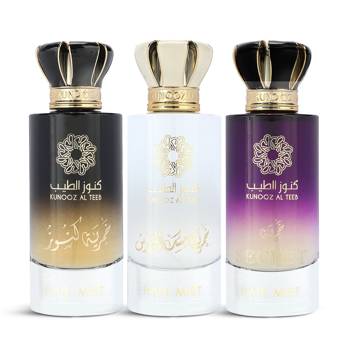 مجموعة عطور الشعر تتكون من ثلاثة أنواع: عطور كنوز، عطور سيكريت، وعطور العروس.