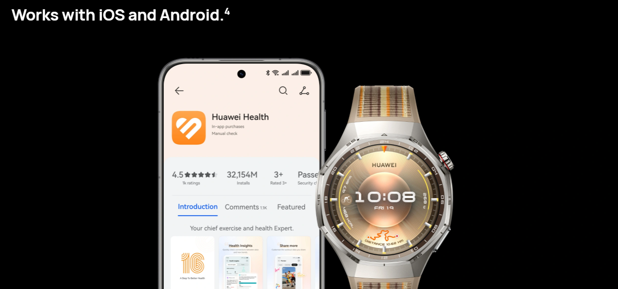 تعمل الساعة مع أجهزة iOS وAndroid، مما يوفر توافقًا واسعًا. تدعم الساعة الاتصال عبر البلوتوث، وتشغيل الموسيقى، والتقاط الصور بضغطة زر مزدوجة، وحتى التحكم عن بُعد في الكاميرا لالتقاط صور سيلفي. تتيح لك المذكرات الصوتية السريعة تدوين أفكارك فورًا، بينما يمكن مزامنة بيانات ركوب الدراجات والإنجازات ومشاركتها مباشرةً من الهاتف. كما تدعم الساعة تطبيق HUAWEI Health+، الذي يمنحك ثلاثة أشهر من الميزات المتميزة، مثل جلسات التأمل الموجهة، وخطط التمارين الرياضية المخصصة، وتمارين التنفس.