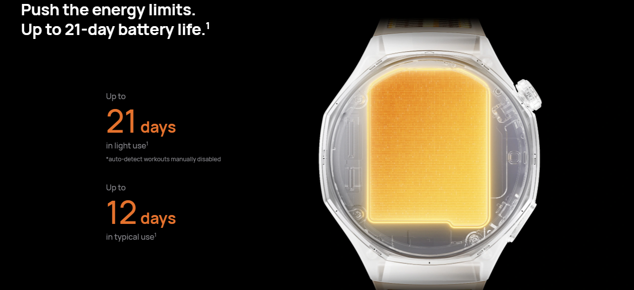 تعمل الساعة ببطارية عالية السيليكون تزيد من كثافة الطاقة بنسبة 37%. تدعم البطارية ما يصل إلى 21 يومًا من الاستخدام في الوضع الخفيف، و12 يومًا في الاستخدام العادي، و7 أيام مع تفعيل ميزة الشاشة الدائمة. أما بالنسبة للرياضات الخارجية، فتوفر البطارية ما يصل إلى 40 ساعة من التحمل لركوب الدراجات أو الجري على الطرق الوعرة، مما يتيح للمستخدمين تجاوز حدود طاقتهم دون القلق بشأن عمليات الشحن المتكررة.