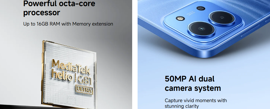 يعمل هاتف Redmi 15C بمعالج MediaTek Helio G81-Ultra ثماني النواة، مما يوفر أداءً ثابتًا وفعالًا. فهو قادر على أداء المهام اليومية بسلاسة ويحافظ على استقراره حتى أثناء فترات الاستخدام الطويلة. مع إمكانية توسيع الذاكرة، يوفر الجهاز ذاكرة وصول عشوائي (RAM) بسعة تصل إلى 16 جيجابايت لتحسين تعدد المهام والاستجابة العامة.