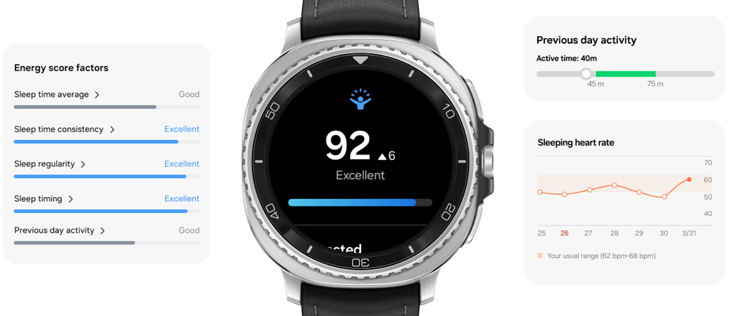 بفضل ميزاتها المدعومة بالذكاء الاصطناعي، مثل "مؤشر الطاقة"، تُقدم الساعة رؤى يومية بناءً على نومك ونشاطك ومعدل ضربات قلبك. كما تُساعدك على تحسين روتينك اليومي من خلال عرض اتجاهات الطاقة وتقديم اقتراحات استباقية.