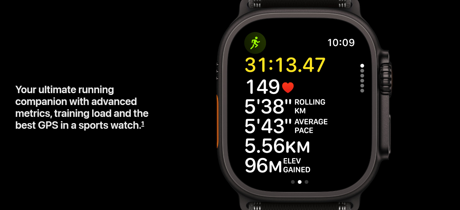 Apple Watch Ultra 3 is designed as the ultimate companion for runners. It brings dual-frequency precision GPS for the most accurate route tracking in a sports watch, ensuring that every stride is measured correctly. Runners benefit from advanced metrics such as running power, cadence, VO2 max estimation, and personalised Heart Rate Zones. Features like Race Route, Pacer, and Custom Workouts make it possible to train smarter, while Workout Buddy uses Apple Intelligence to give personalised audible motivation during your sessions. Integration with apps like Strava enhances real-time competition and motivation.