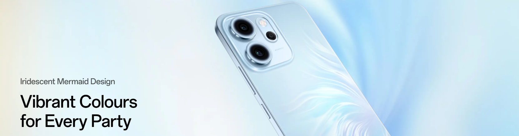 The device features an Iridescent Mermaid Design with a dynamic color-shifting back, complemented by a Gradient Aura Design for an elegant camera look. Its ultra-slim body (as thin as 7.69mm, 180g) comes in Opal Blue, Luminous Green, and Glossy Pink finishes. The 6.57" OLED display supports 120Hz adaptive refresh, 1.07B colors, FHD+ resolution, and works in wet or gloved conditions.