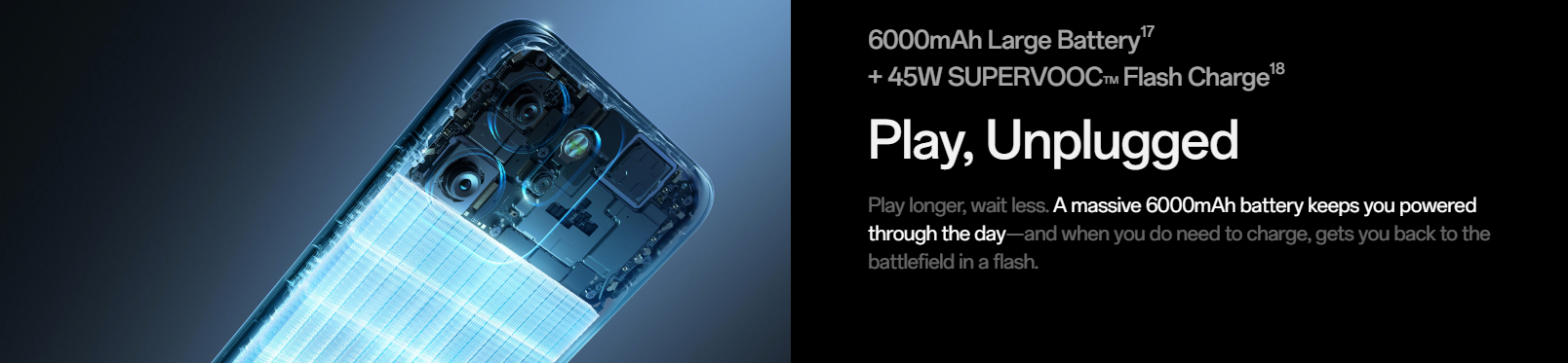 The 6000mAh battery supports up to 2.24 days of regular use, 10 hours of MOBA gaming, or 7.4 hours of calling. With 45W SUPERVOOCTM fast charging, it can go from 1% to 100% in about 79 minutes, or deliver several hours of gameplay with just a 10-minute charge.