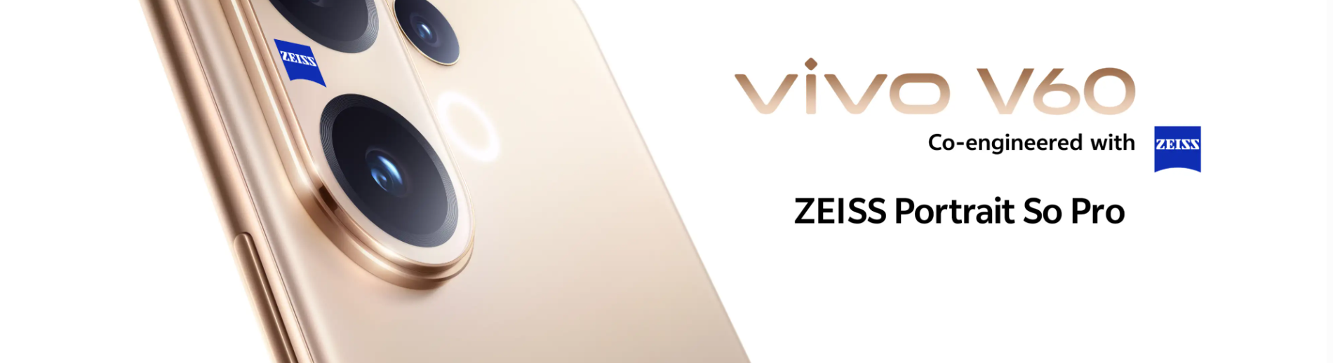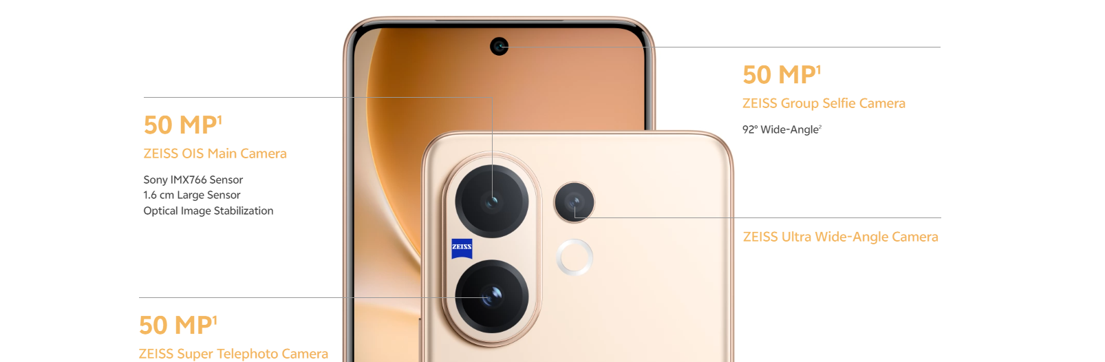 The vivo V60 features a triple 50 MP ZEISS camera setup, making it a professional-grade portrait phone. It includes a 50 MP ZEISS OIS main camera with Sony IMX766 large sensor for crisp, stabilized shots, a 50 MP ZEISS super telephoto camera with Sony IMX882 for long-range clarity with optical zoom, and a 50 MP ZEISS group selfie camera with a wide-angle 92° lens for group selfies and detailed portraits. Additionally, the ZEISS ultra wide-angle camera ensures versatile framing. This system enables multifocal portraits with 85 mm cinematic close-ups and 100 mm close-up shots that capture fine expressions with emotional depth.